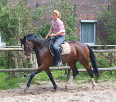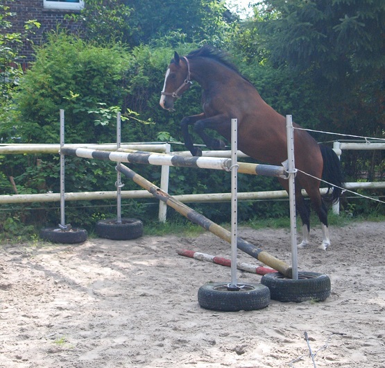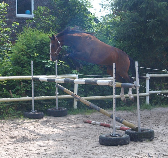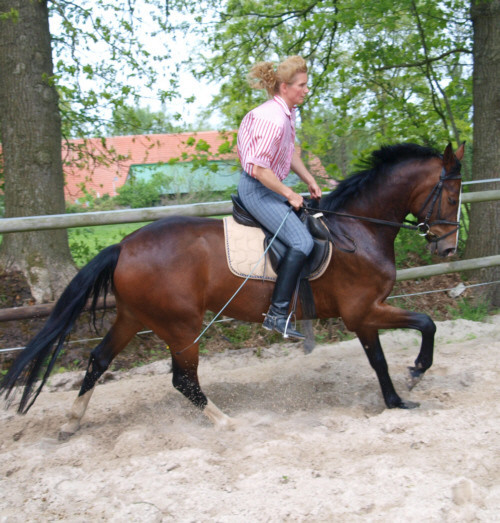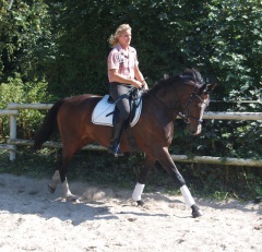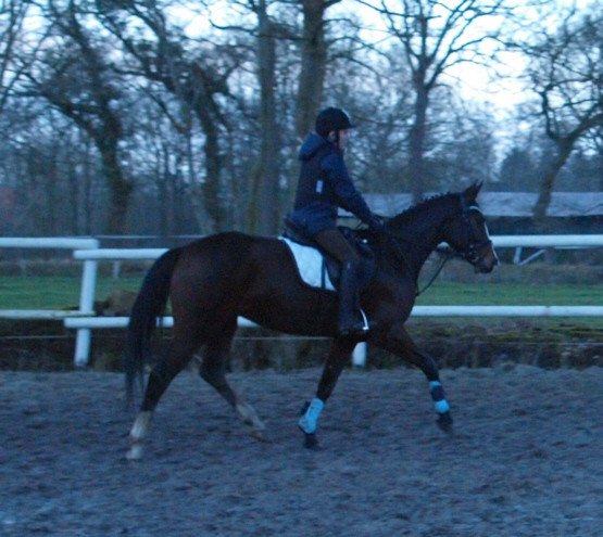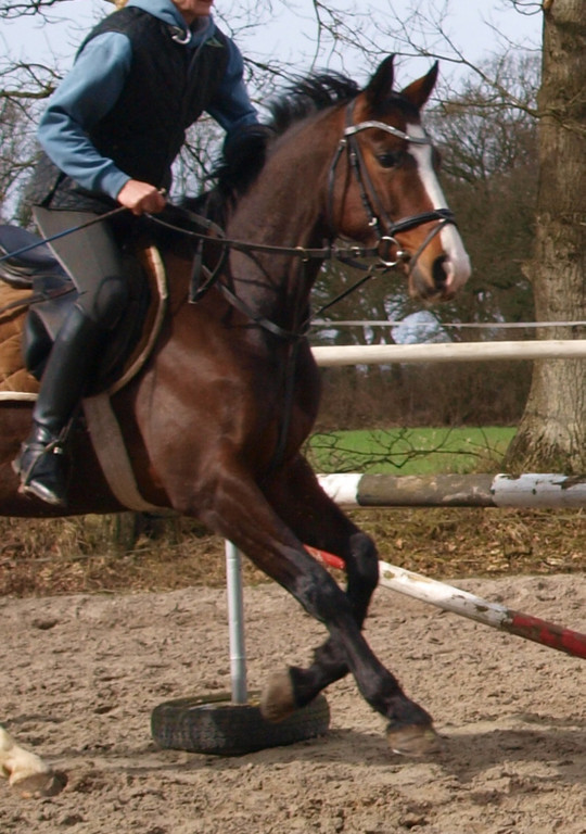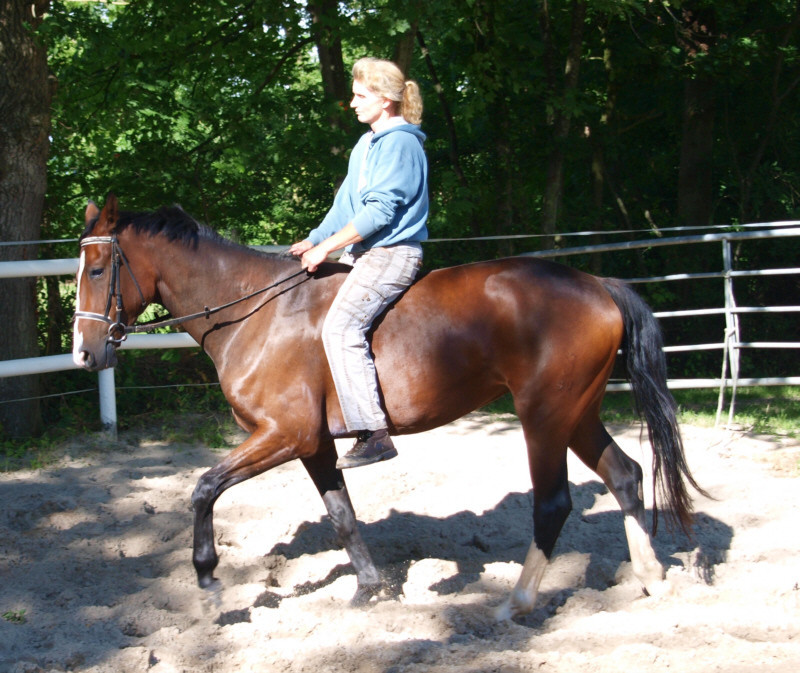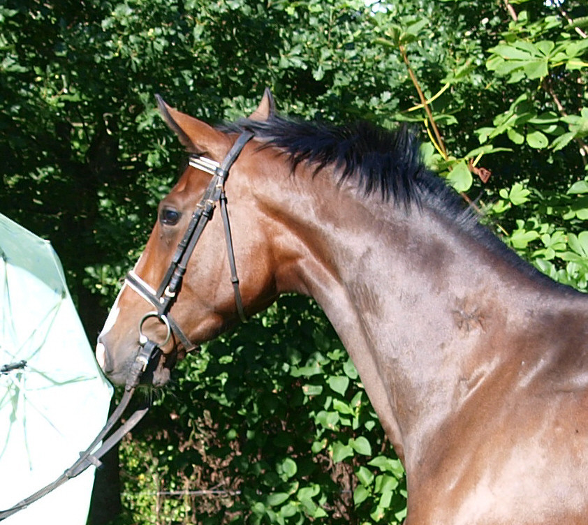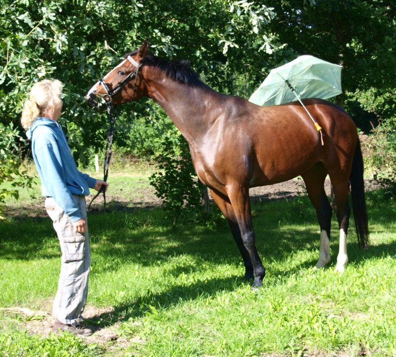 Aus ihr ist eine bewegungsstarke, sympathische, unkomplizierte und schicke oldenburger Stute geworden. Man kann wirklich mit dieser jungen Dame fast allles anstellen. Ob sie über eine Plane laufen soll, oder der Reiter diese mitträgt, einen Regenschirm (er-)tragen muss oder auch ohne Sattel geritten wird, Bella stört eigentlich nichts. Mit einem derzeitigen Stockmaß von 1,64m liegt sie im Gardemaß. Eine Offerte für den ambitionierten Turnier- oder auch Freizeitreiter.